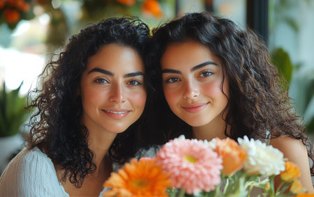 Women with curly hair smile while sitting together at a table decorated with colorful flowers in a bright cafe. The atmosphere is inviting and cheerful.