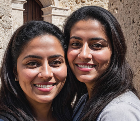Close up portrait of two adult sisters embracing, smiling warmly at the camera, showing happiness, connection, and family bond.
