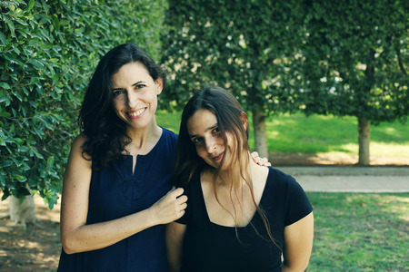 Portrait of beautiful smiling mother and daughter standing outside in park