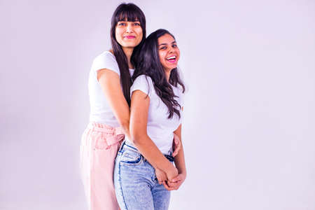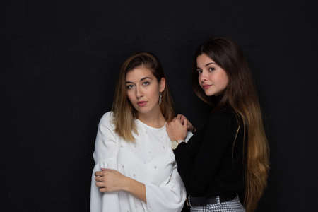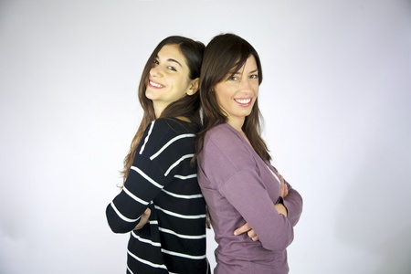 Portrait of two young happy girls, studio shoot,