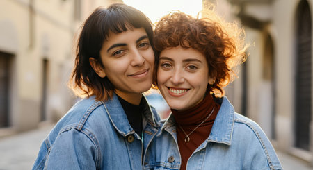 Cheerful young females in denim jackets embrace diversity in sunlit urban street scene