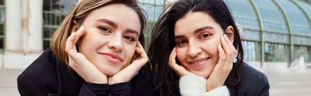 banner of cheerful lesbian couple looking at camera near Palmenhaus in Vienna on background