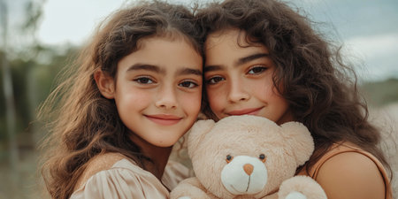 Sisters share a joyful moment outdoors while cuddling a soft teddy bear amidst a serene landscape under soft clouds. Generative AI
