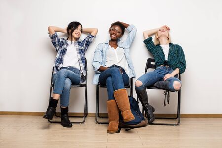 concept of diversity with three different women, asian, caucasian and afro american sitting on chair in a waiting room