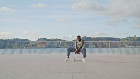 Handsome young guy in casual style relax on wooden chair enjoying fresh air idyllic cloudy sky for copy space, outdoor