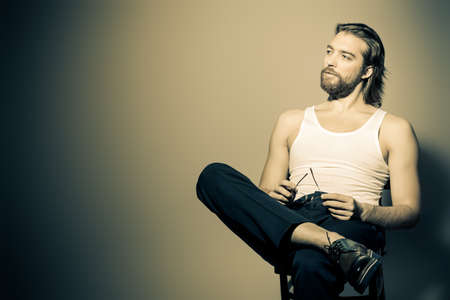 Young man sitting on a chair in an empty room and looking down