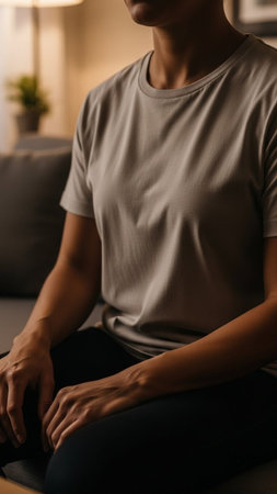 cropped shot of woman in grey t-shirt sitting on sofa at home