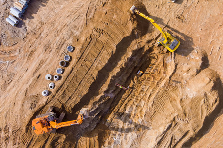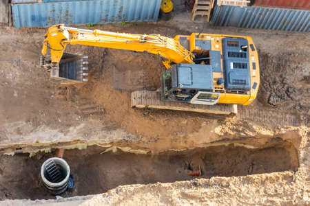 Digger on earthworks in excavator dig the trenche at construction site on arial view of the laying sewer pipes
