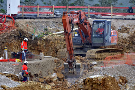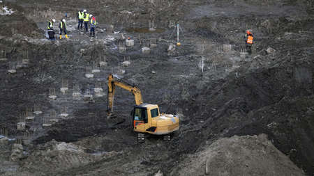 Kiev, Ukraine, October 17, 2018: Workers in the mud of a construction site at the stage of excavation; construction of a supermarket AUCHAN