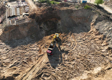 Excavator load the sand into dump truck. Loader digging ground for foundation pit. Earthmoving at construction site. Aerial view of an backhoe on earthworks.