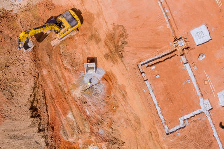 During the preparation of a new home, a trench under in the concrete foundation is dug an aerial top view