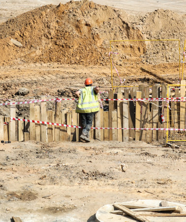 KYIV, UKRAINE - May 20, 2021: Earthworks at the construction site of the city. Repair work in the city sewerage system. Worker in a special suit with a shovel