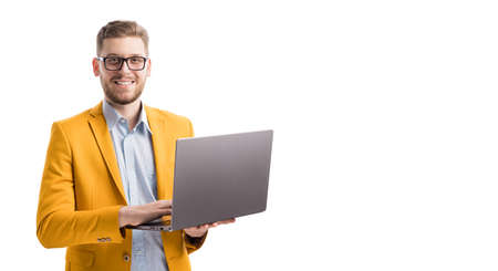 Caucasian stylish business man working with laptop