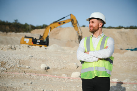 Extraction of stone. Male worker next to stone quarry. Engineer at construction site.