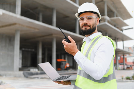 Male engineer working on a construction site, holding a laptop and communicating on a walkie talkie, ensuring project progress