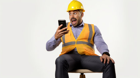 Triumphing happy engineer holds mobile phone raises clenched fist uses phone rejoices being on construction site wears formal suit and orange helmet Young architect gets : Generative AI