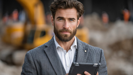 A man with blue eyes and a beard, wearing a suit jacket and white shirt, holds a tablet computer. He is standing in front of a blurred yellow excavator at a construction site. The man looks directly at the camera with a serious and confident expression.