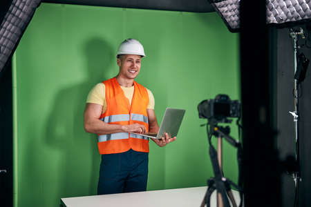 Joyful male builder using laptop and recording video