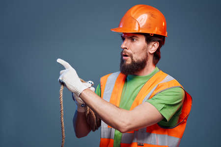 Brutal beard worker man suit construction worker in safety orange helmet with adjustable wrench.
