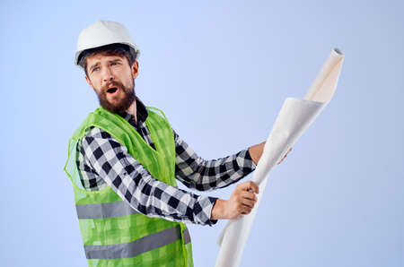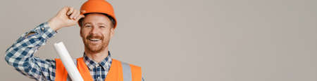 White man worker wearing helmet and vest posing with drawing isolated over grey background