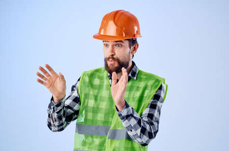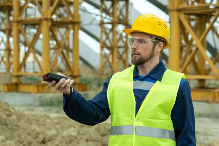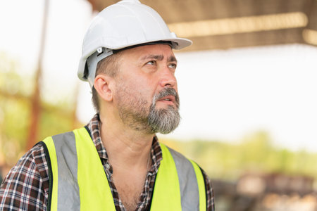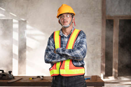 The picture of the construction worker or project manager is working on the construction site while wearing hard hat and safety jacket also require skill like safety knowledge, technical skill. AIG43.