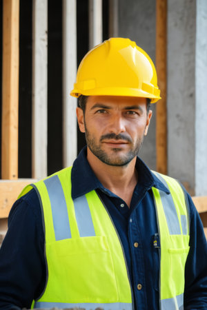 A construction worker with a well-defined jawline and intense gaze looks directly at the viewer while wearing a bright yellow hard hat, emphasizing his dedication to safety and professionalism.