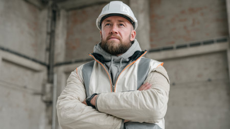 A confident construction worker stands with arms crossed in an industrial setting, showcasing safety gear and a serious professional demeanor.