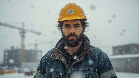 Powerful outdoor scene showing a construction worker wearing a yellow hard hat and a winter jacket, standing in a snowy environment. Snowflakes fall gently around the figure, while construction materials and equipment are visible in the blurred background, suggesting an active worksite.