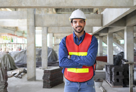 attractive young male engineer wearing safety gear,standing arms crossed,smiling confident, backgroud blurred a new building under construction site