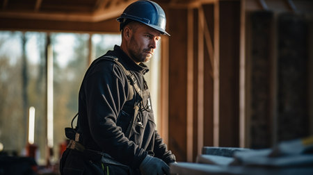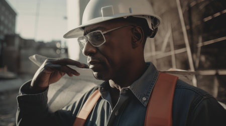 Experienced mature african descent male construction worker wearing protective gear and displaying a focused and serious facial expression while working at the construction site