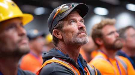 A man in a hard hat and safety vest is looking up at something. The other people in the room are also wearing safety gear and looking up. Scene is serious and focused