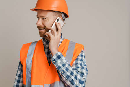 White man worker wearing helmet talking on mobile phone isolated over grey background