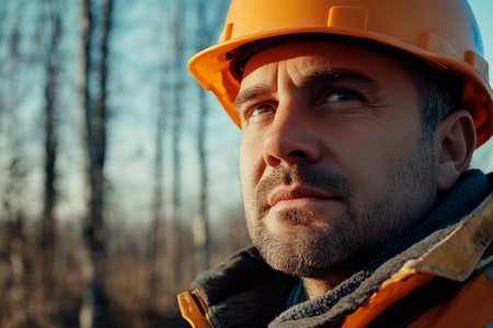 A focused construction worker wearing an orange hard hat gazes thoughtfully into the distance. Surrounded by tall trees, he appears to be evaluating a project site during the calm afternoon.