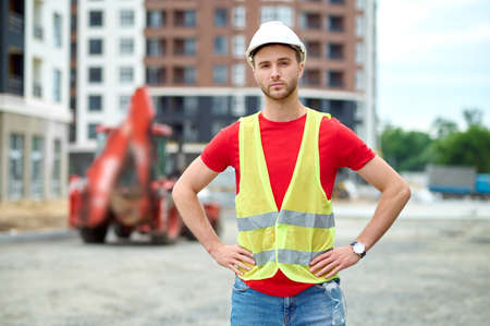Waist up portrait of young man working at construction site and looking at cityskape, copy space