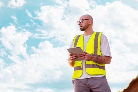 Male engineer with white helmet and safety vest is taking notes on a digital tablet while inspecting a construction site at sunrise in early morning, vertical front view. Architecture and engineering
