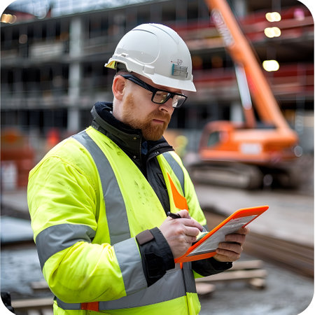 A vigilant construction professional in a bright safety gear surveys ongoing development amid towering cranes and modern cityscape silhouettes, capturing urban growth ene