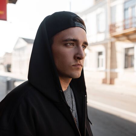 Portrait of a young handsome man in fashionable black clothes with a hood in a stylish cap near a vintage building on the street on a sunny summer day. Attractive guy of walks around the city.