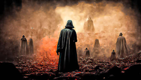 Scary figure in hooded cloak with spike studs mask over dark misty background