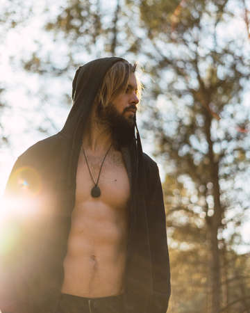 Portrait of young bearded man with beautiful sunlight, he is hooded