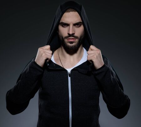 attractive young man wearing gym sport, holding hands and pulling hoodie, standing on grey background