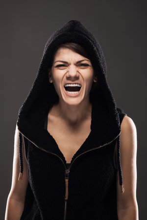 Beautiful angry girl with black hoodie. Lady screaming of discomfort against dark gray background.