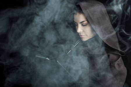 Mysterious witch in mantle with hood on dark background. black and white effect
