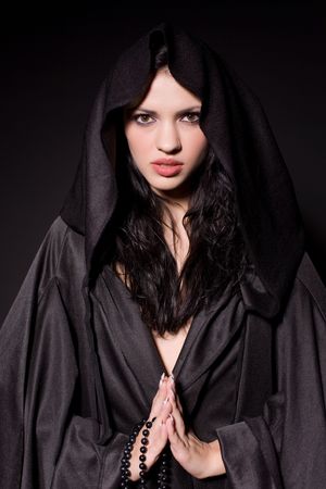 Praying girl in nun outfit over black background