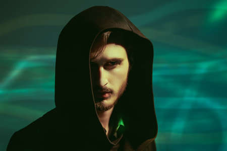Studio portrait of a brutal brunette man looking intently and cautiously at the camera from under a black hood. Green background. People and emotions.