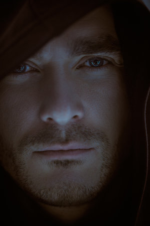 Close-up portrait of a brutal man with a heavy look, hiding his face under a black hood. Psychological art portrait.