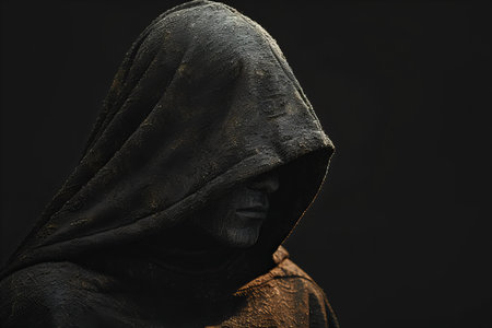 Dark moody portrait of a mysterious hooded man emerging from shadows. Low-key cinematic lighting creates a dramatic, secretive atmosphere, symbolizing anonymity, secrecy, danger, or inner conflict. Perfect for concepts related to mystery, noir, thriller, fantasy, or psychological themes.