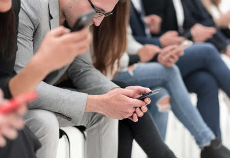 Unrecognizable man and women sitting in queue waiting for job interview using smartphones and making notes