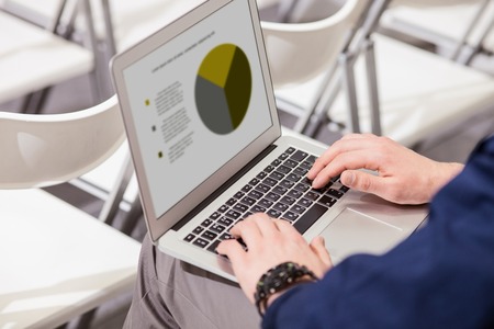 Close up of male hands typing on a laptop in auditory hall. The man is sitting and holding a computer on his knees