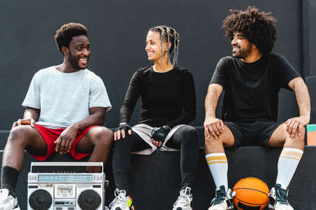 Young multiracial people having fun listening music with vintage boombox outdoor - Urban street people lifestyle
