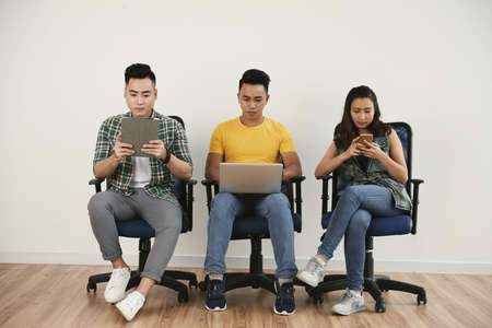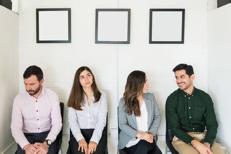 Bored candidates talking while waiting for job interview at office